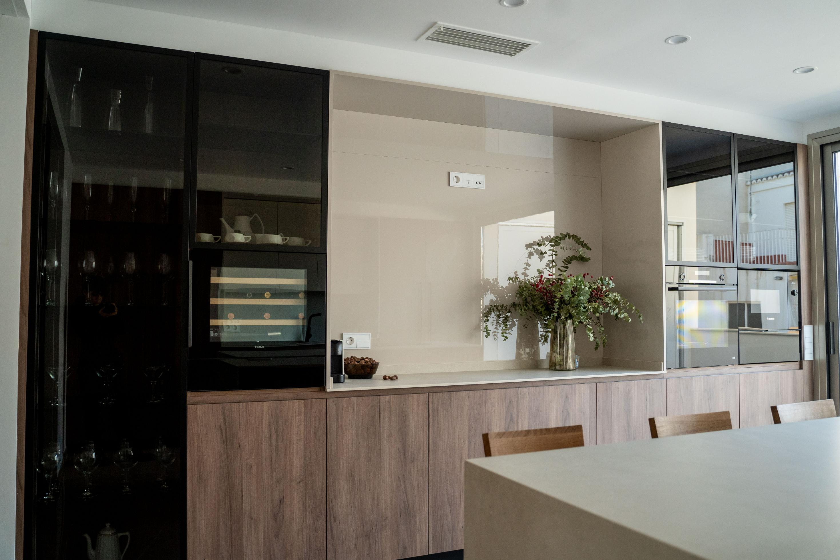 ACABADOS: Unika Olmo, tirador Confort Fit y Vitrinas con perfil Slim.